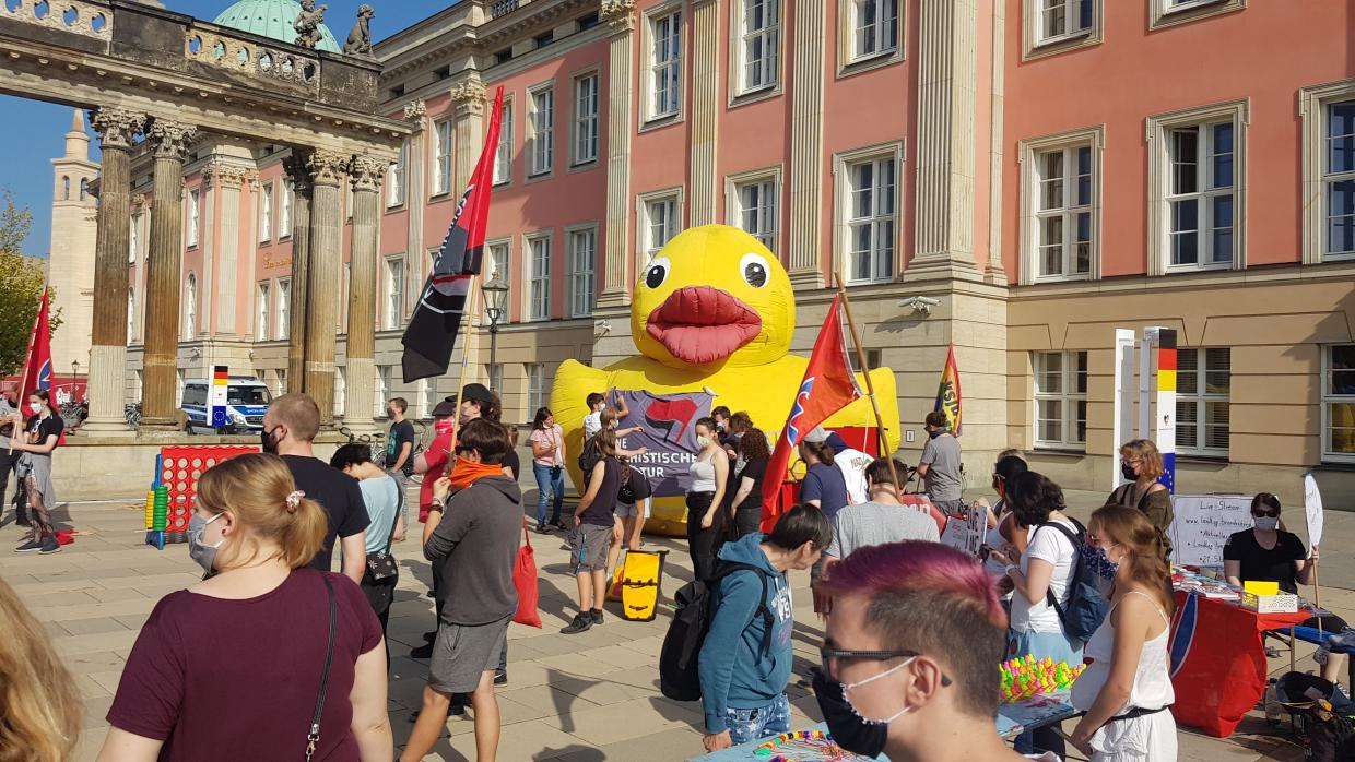 So kamen auch viele Unterstützer_innen zur Kundgebung, die parallel zur Debatte vor dem Landtag in Potsdam stattfand. Die Falken Brandenburg hatten unter dem Motto „Mehr statt keine Fördermittel – Rassismus und Hetze sind für UNS keine Alternative!“ dazu aufgerufen.