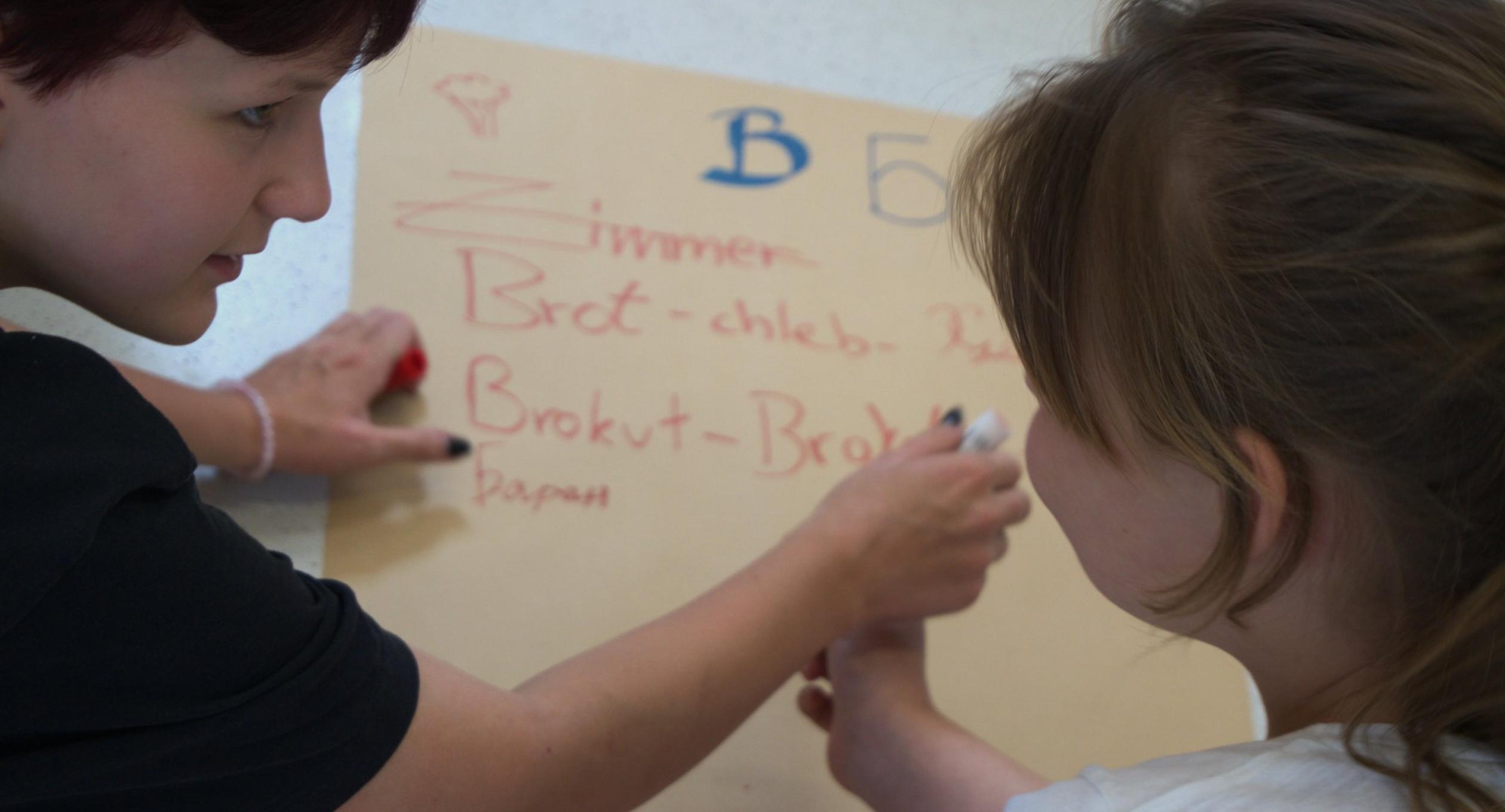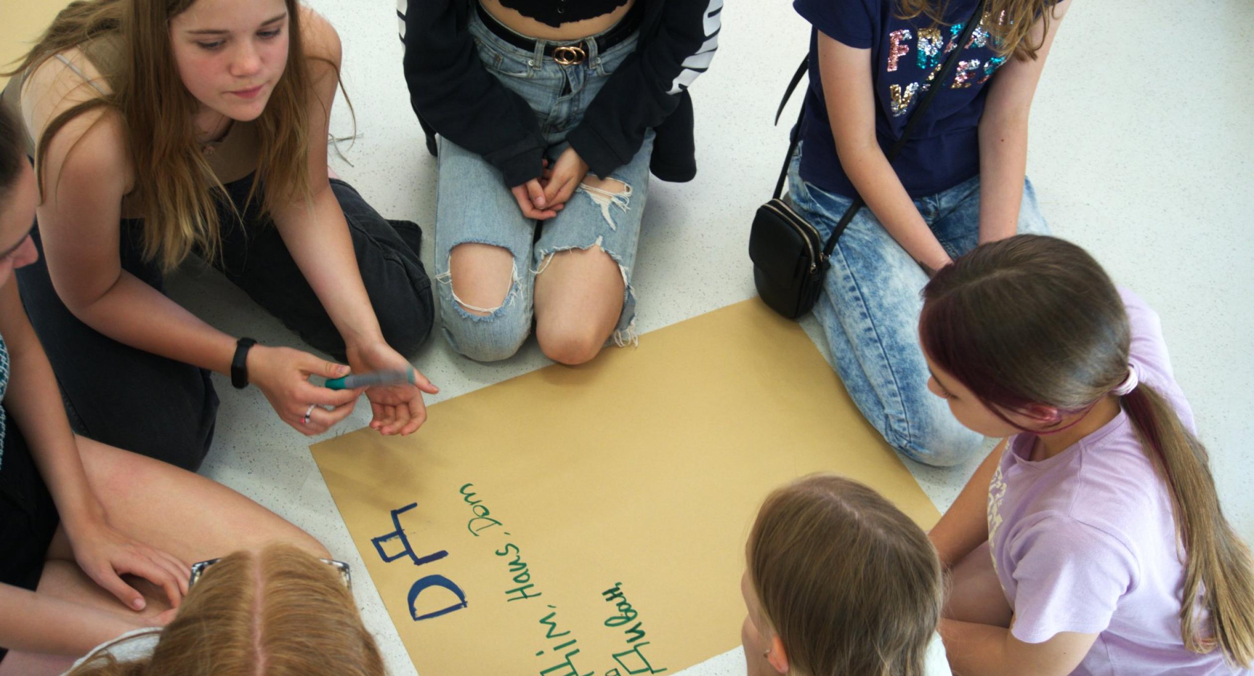 Unter dem Titel „Deutsch-polnisch-ukrainischer Kultursommer“ begegneten sich parallel zur Kreativferienwerkstatt 55 Kinder und Jugendliche aus drei verschiedenen Ländern in der Bildungsstätte. Gemeinsam sitzen sie in der geräumigen Halle, überall auf dem Boden verteilt liegen große Bögen Papier. Die Kinder und Jugendlichen sollen sich gegenseitig Begriffe erklären – mit Händen und Füßen kommunizieren sie und übersetzen die Wörter in ihre jeweilige Muttersprache. Angeleitet wird diese Methode ebenfalls dreisprachig, die Teamer*innen übersetzen Satz für Satz und leiten das Seminar gemeinsam an. Darüber hinaus wurden in diesem Jahr fünf Kreativworkshops angeboten: Theater, Zirkus, Siebdruck, Zeitrafferanimation und ein Workshop zu Pflanzen und Käfern. Besonders beliebt war bei den Teilnehmenden in diesem Jahr das Spiel „Wasserbomben-Volleyball“, klar, bei diesen Temperaturen. Zu den Höhepunkten der Woche gehörten ein Ausflug an den See und ein gemeinsamer Trip nach Berlin.